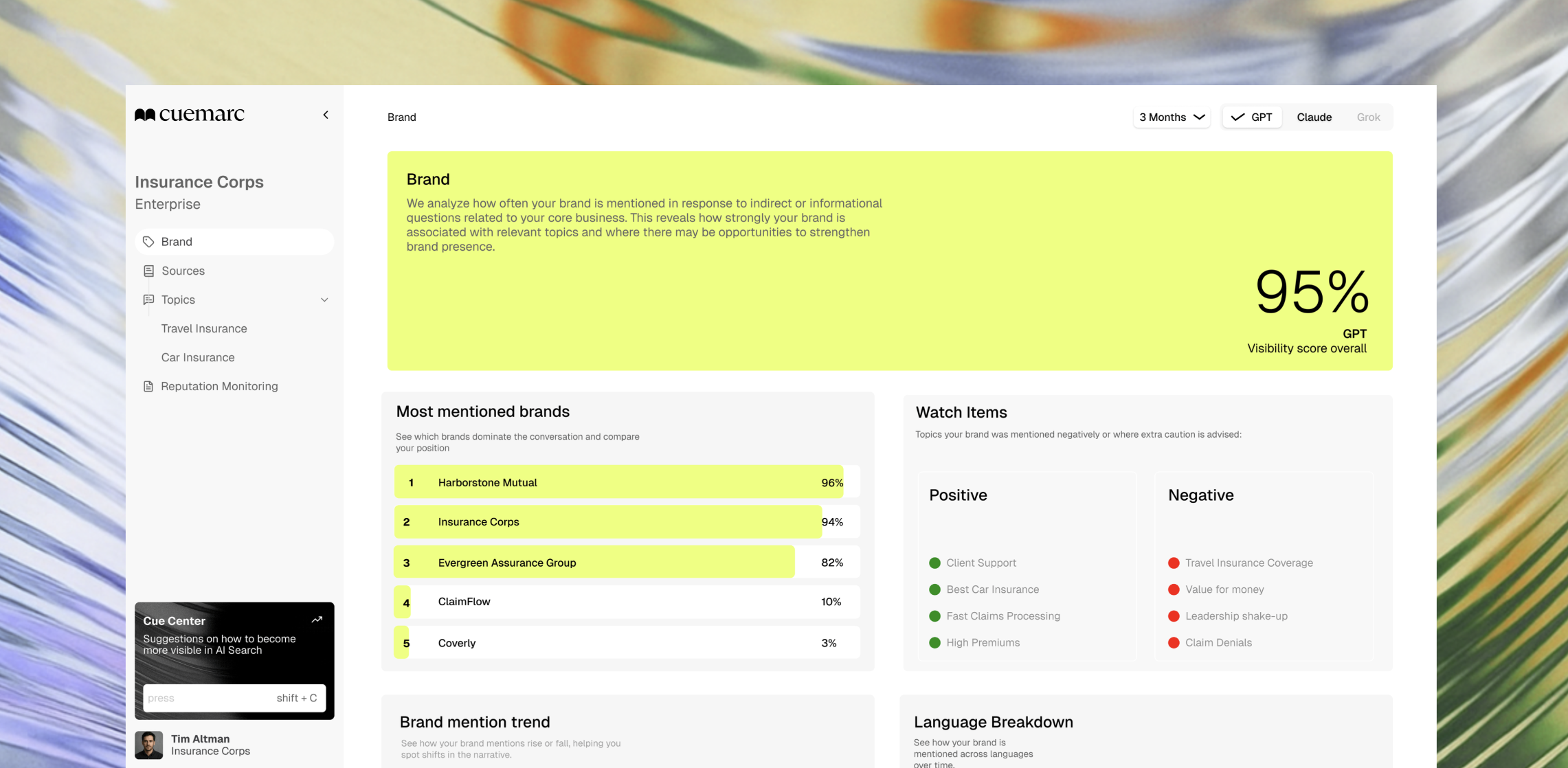 Overview: Cuemarc is an emerging media-intelligence and brand-visibility platform aimed at how brands appear in AI-driven search and large language-model (LLM) results (e.g., ChatGPT, Claude). cuemarc.com+1